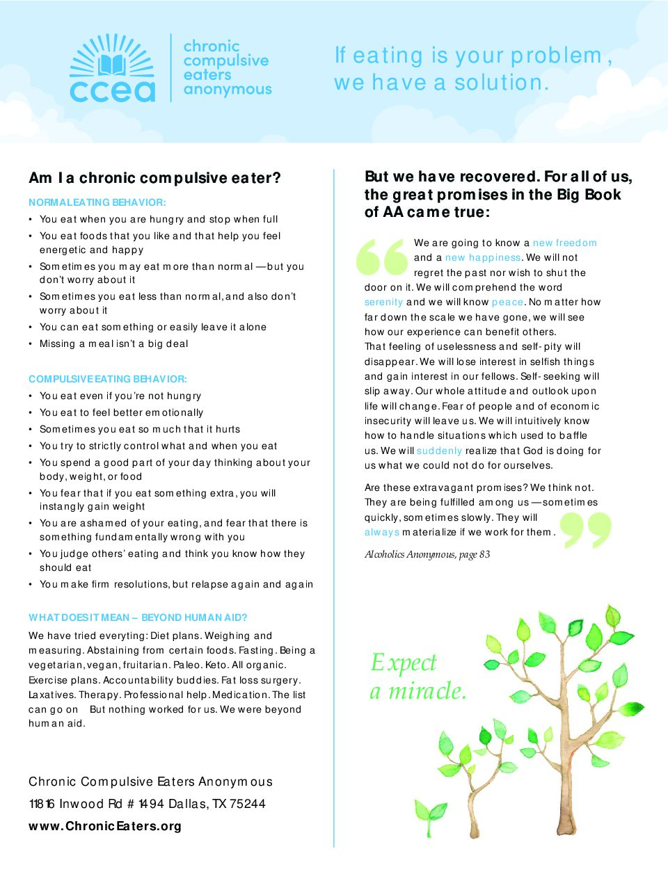 While we are building a fully functional online store, please use the buttons below to purchase CCEA trifold brochures. They come in packs of 5. If you would like a different quantity, or if you require shipping outside of the United States, please contact info@chroniceaters.org